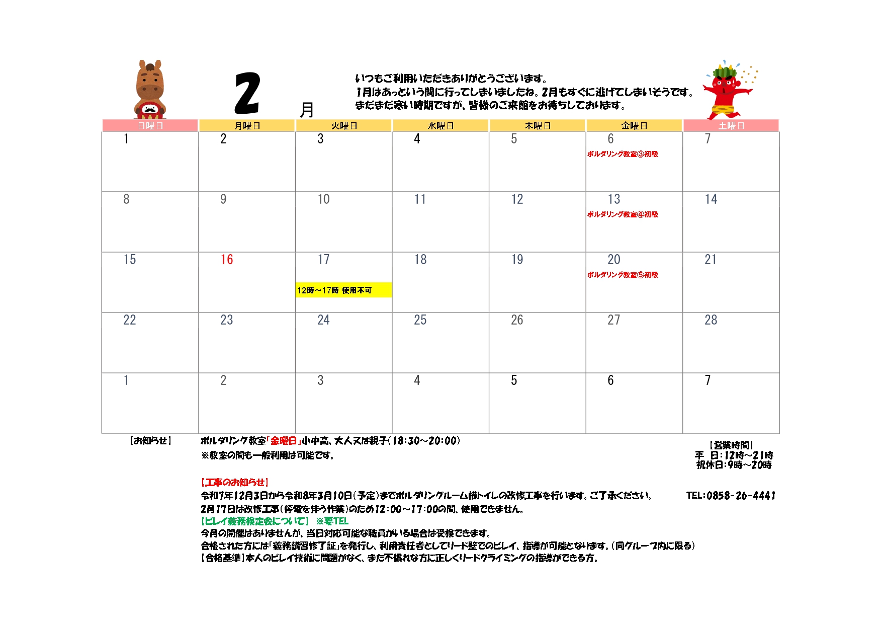 令和8年2月クライミングカレンダーを掲載します。